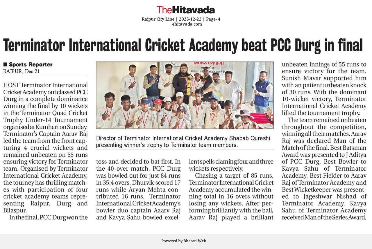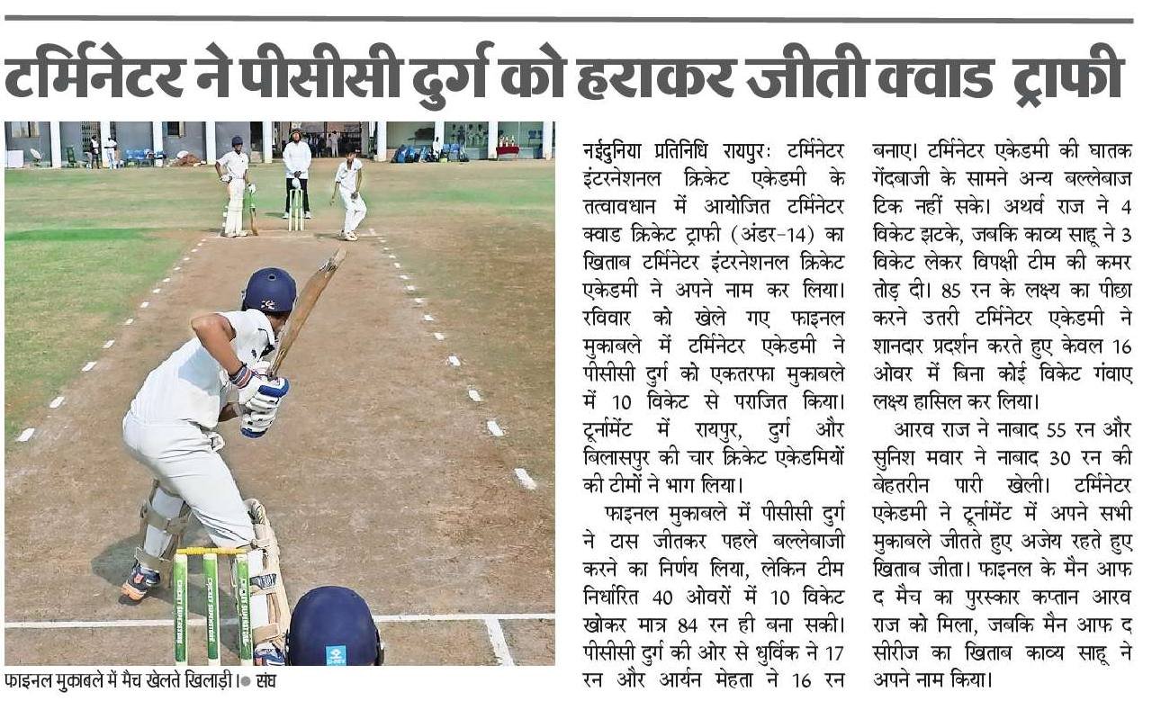 टर्मिनेटर इंटरनैशनल क्रिकेट एकेडमी के तत्वाधान में आयोजित टर्मिनेटर क्वॉड क्रिकेट ट्रॉफी 14 आयु वर्ग में रविवार को टर्मिनेटर इंटरनैशनल क्रिकेट एकेडमी और पि.सी.सी दुर्ग के बिच प्रतियोगिता का फाइनल मुकाबला खेला गया